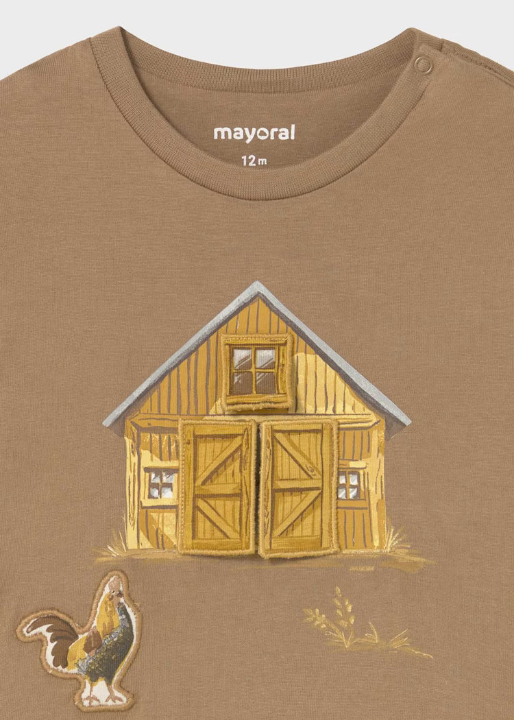 Long sleeved T-shirt for baby. Round neckline. Snap button fastening on the shoulder to allow the garment to be put on easily. 100% cotton. Decorative elements: decorative applique, Print.