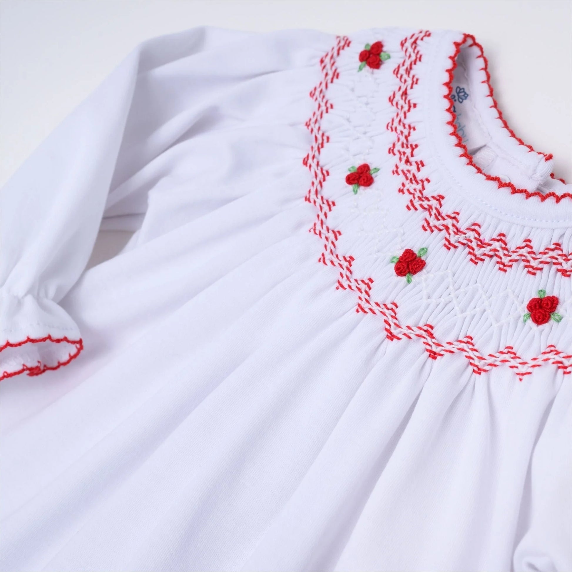 - Bishop Style Smocking: Features elegant red smocking detail across the chest, adding classic holiday charm.