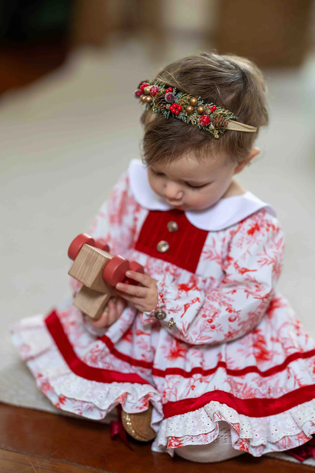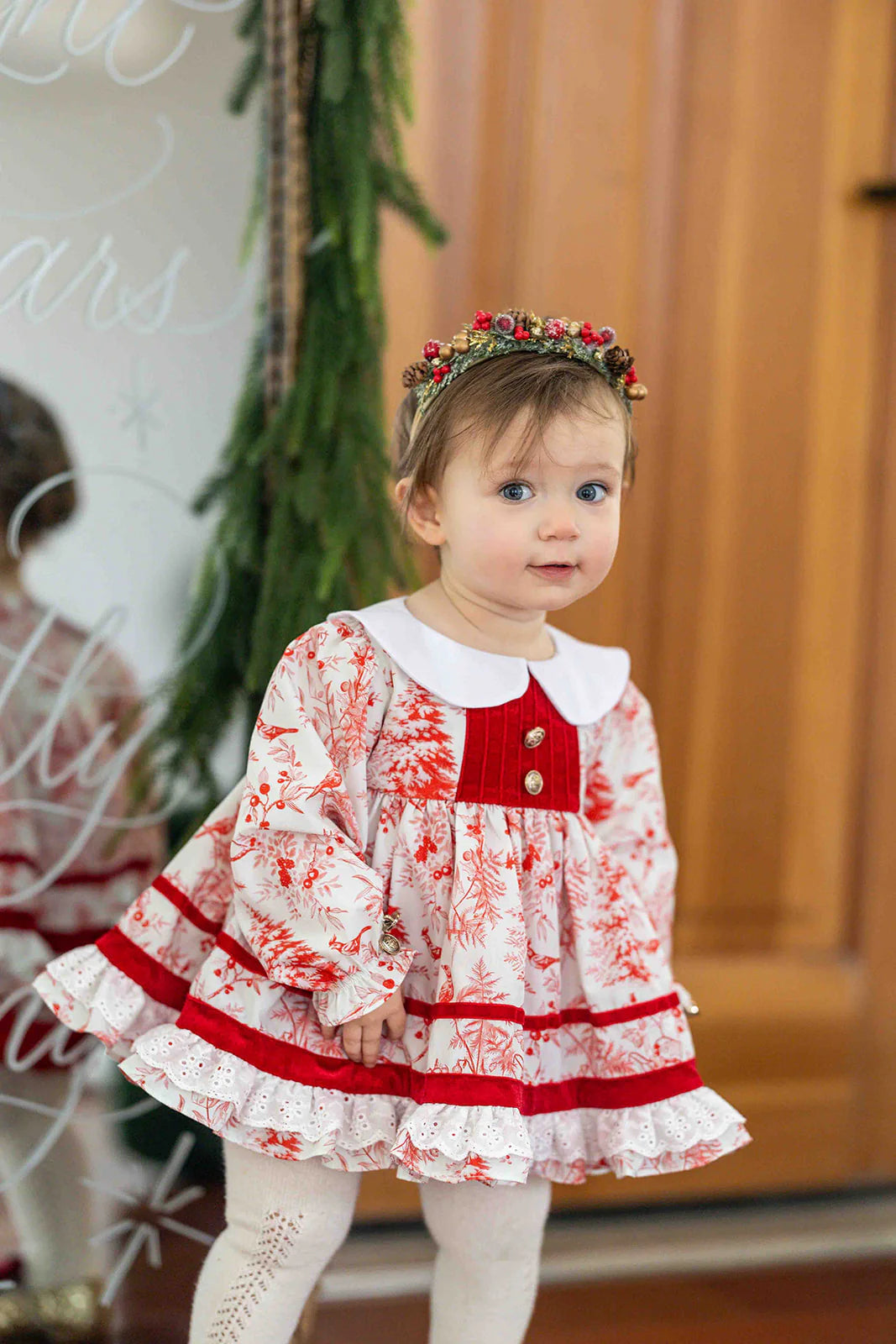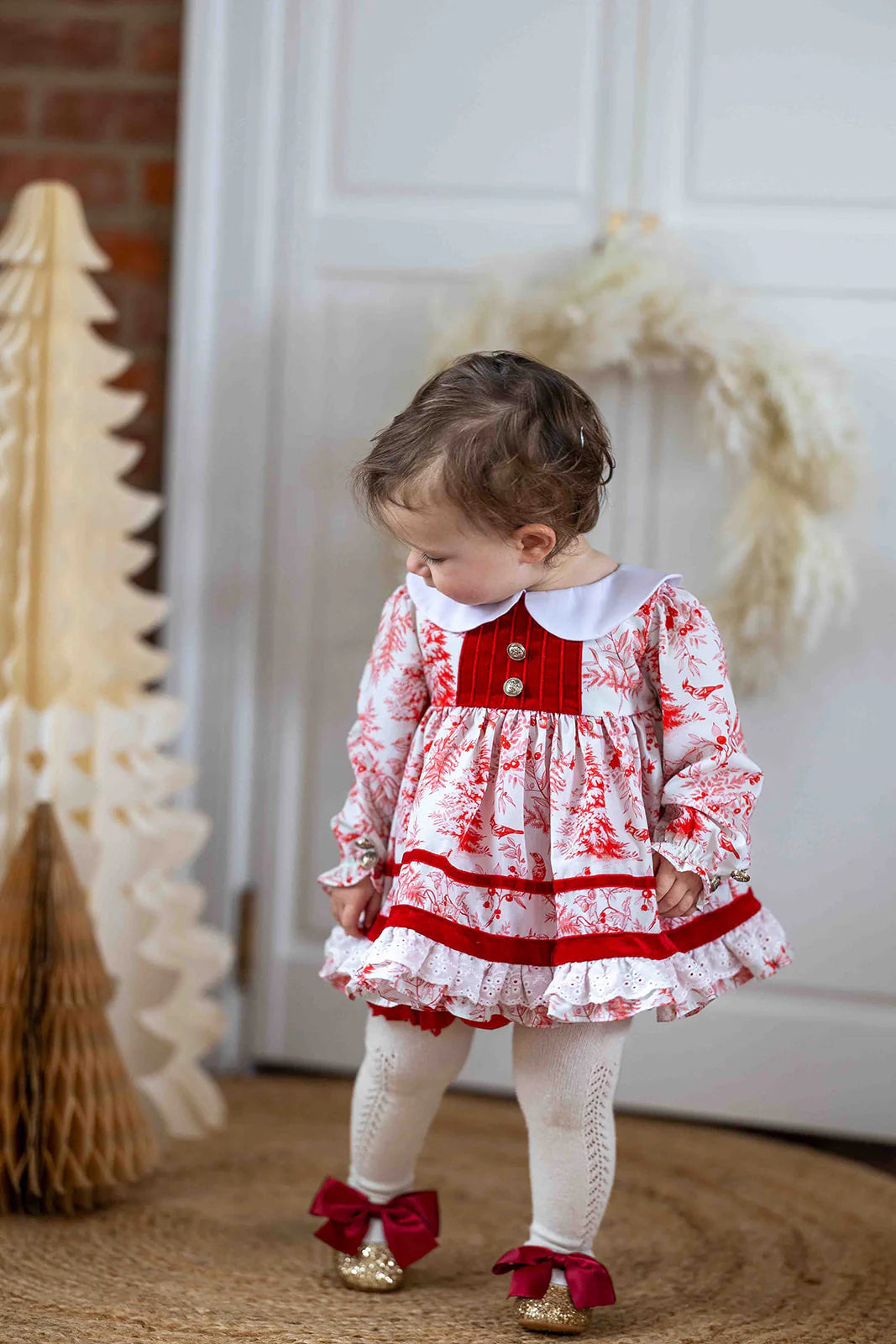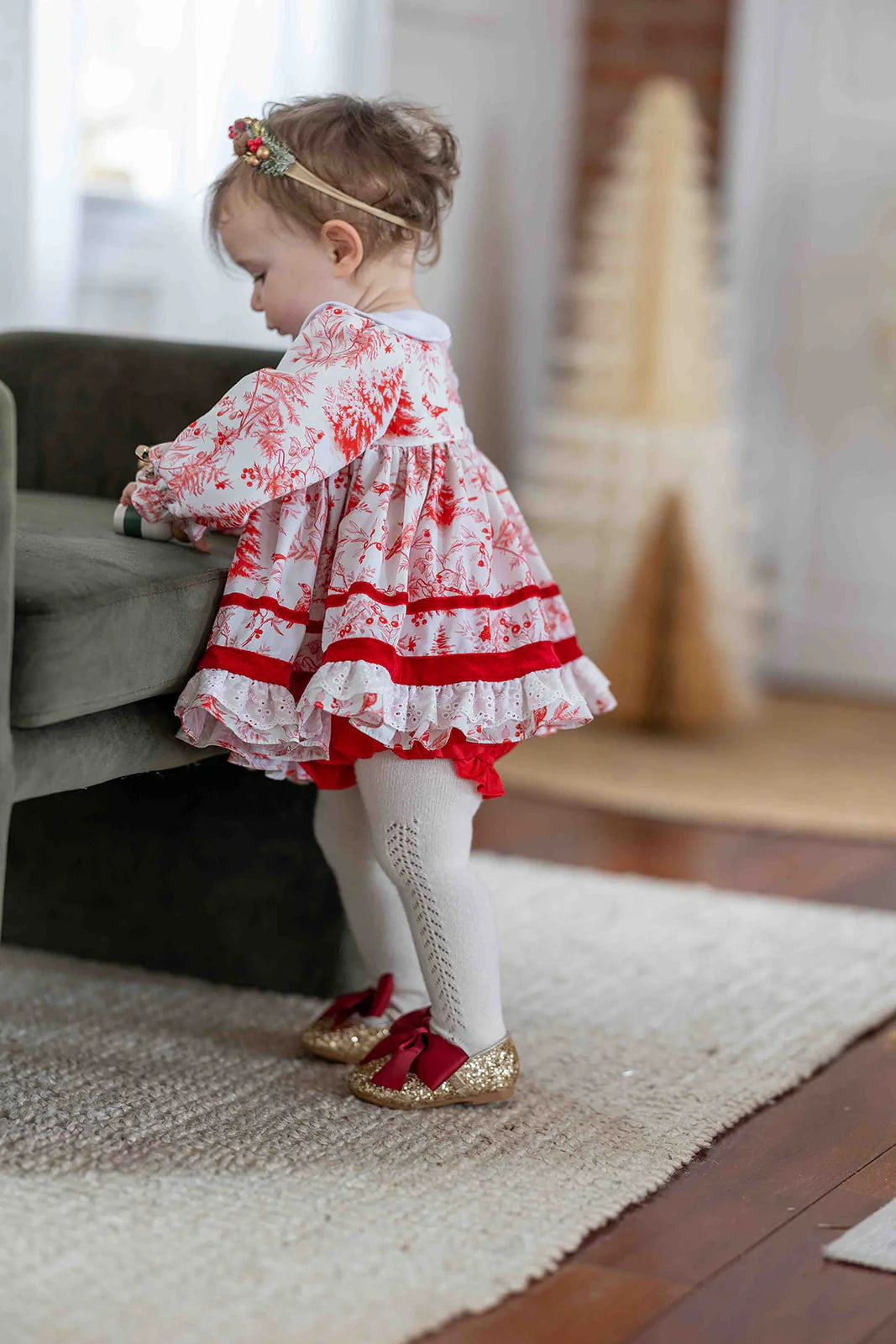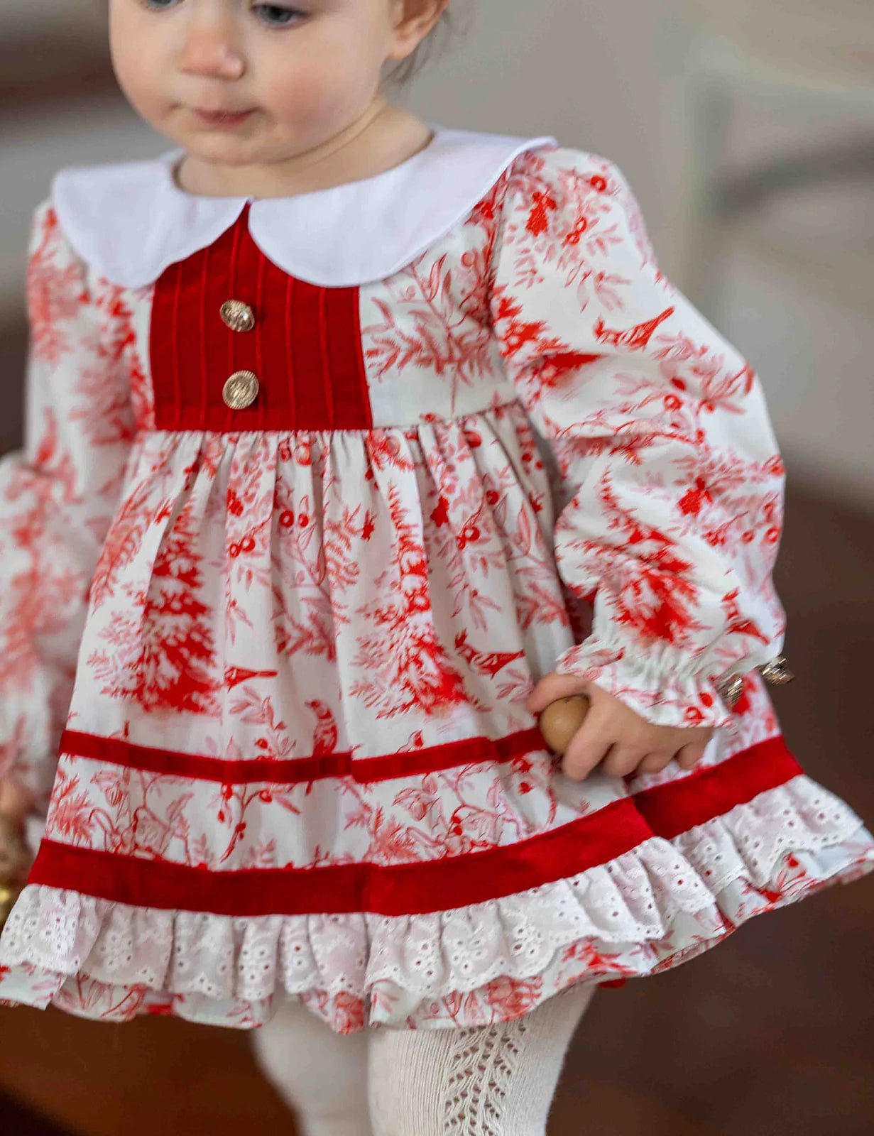 - Red velvet button panel and ribbon trim on skirt