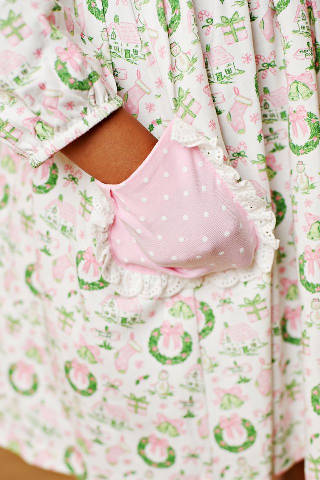 This delightful Holiday Wreath Eyelet Trim Pocket Dress from Swoon Baby Clothing is perfect for your little girl’s festive twirls. Featuring charming eyelet trim and handy pockets, it combines playful style with practical comfort. Ideal for holiday celebrations, this dress lets her dance and explore with ease while looking adorably merry.