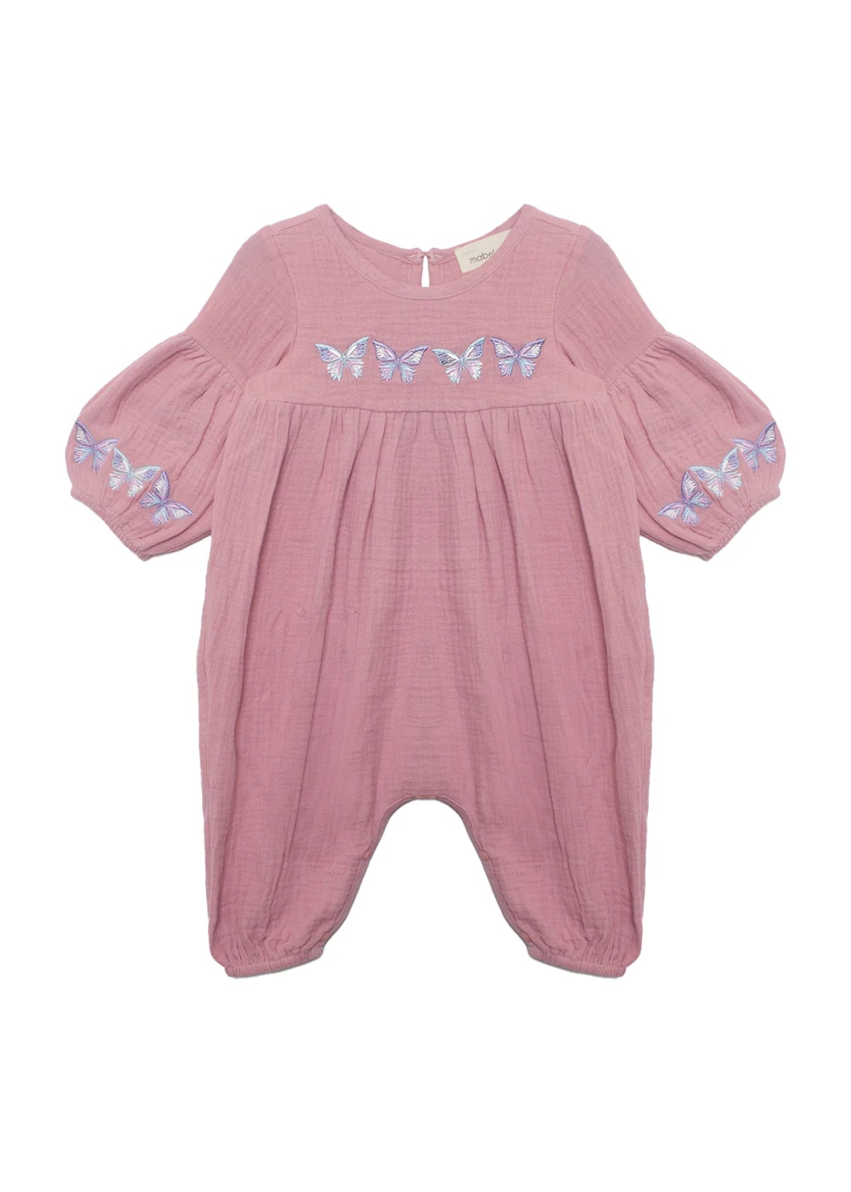 The Lyla Romper is the perfect blend of comfort and elegance for your little one. Its soft pink fabric is designed for all-day wear, while the delicate embroidered butterflies across the chest and sleeves add a sweet, whimsical touch. The gathered detail at the chest ensures a loose, breathable fit, keeping your baby cozy and free to move