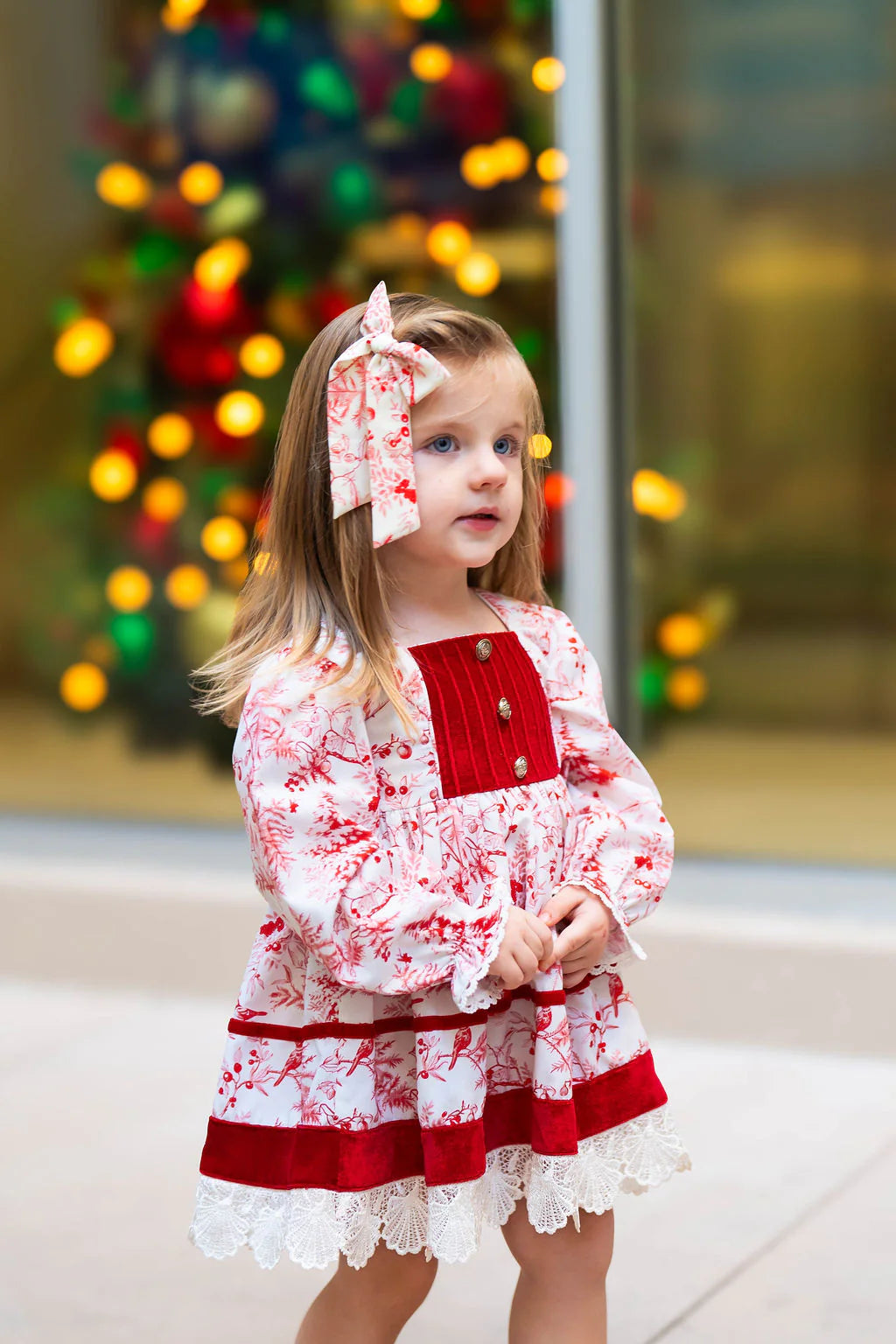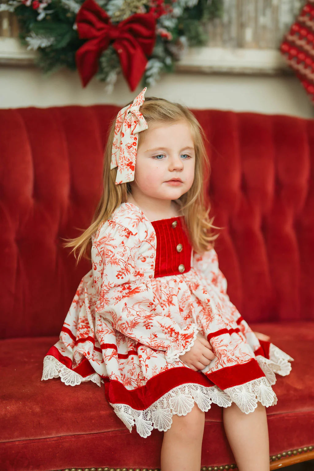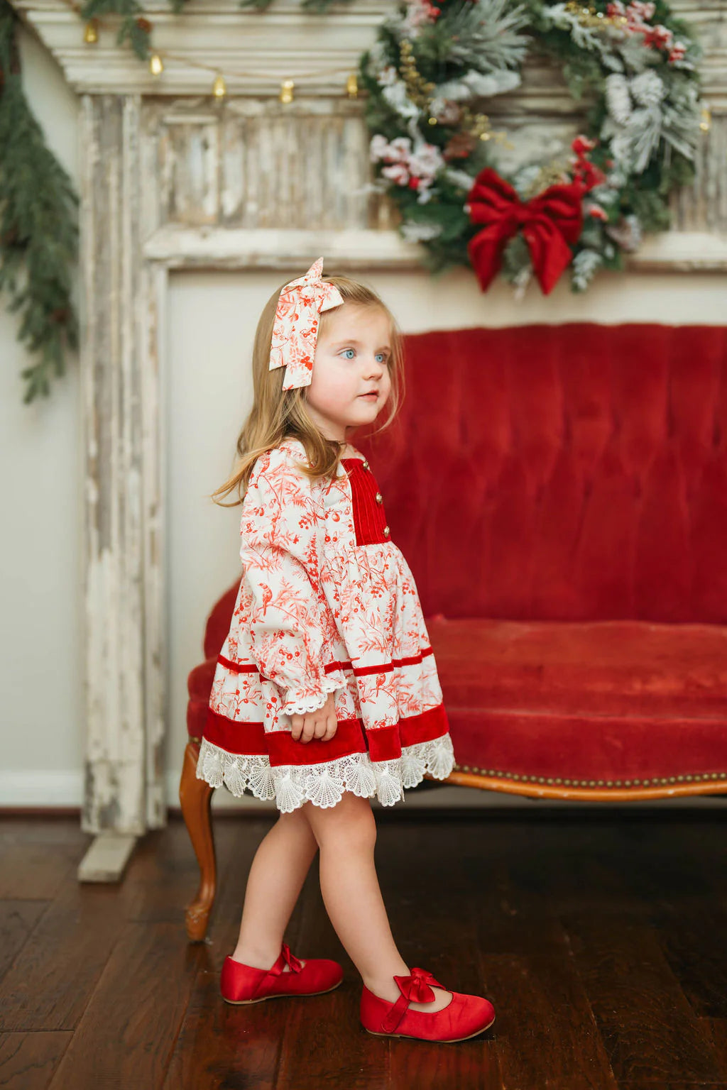 - Red ribbon trim on hemline with an eyelet lace ruffle