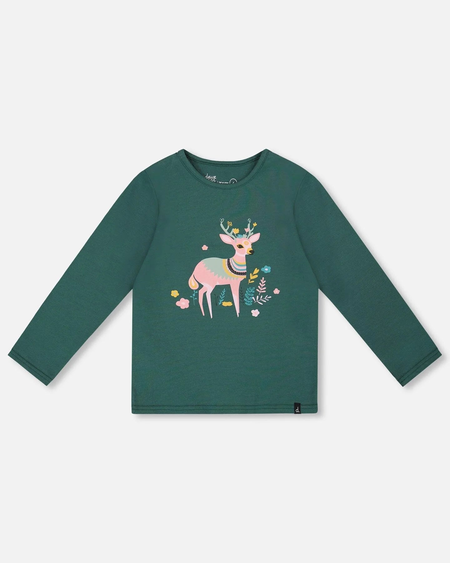 Dreamy and soft, this Organic Cotton Long Sleeve T-shirt Dark Green adds a woodland twist to any outfit. The organic cotton jersey tee features a sweet deer graphic print at the chest, a round neckline, long raglan sleeves, and a fitted silhouette designed for layering or solo wear. A poetic and comfy essential to style with skirts, jeans or leggings from our “Chesnuts In The Woods” collection.