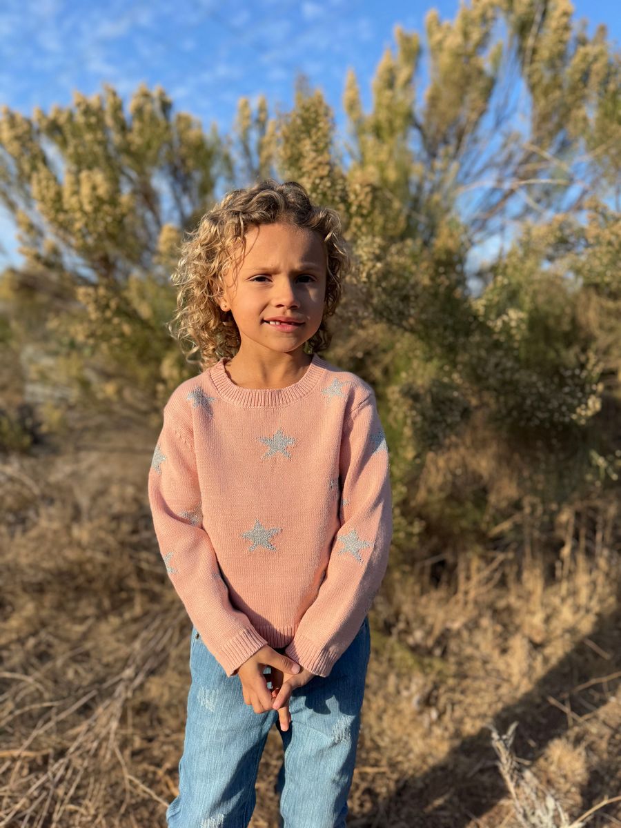 The Robyn Sweater from Vignette is a playful addition to any girl's wardrobe. In a soft pink shade adorned with shimmering silver metallic stars, it adds a touch of sparkle to everyday comfort. Perfect for fun days and cozy moments, this sweater combines style and softness for your little star.