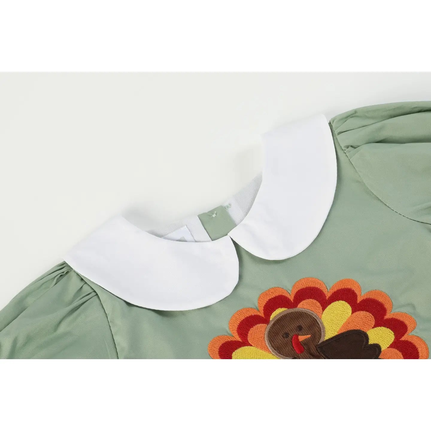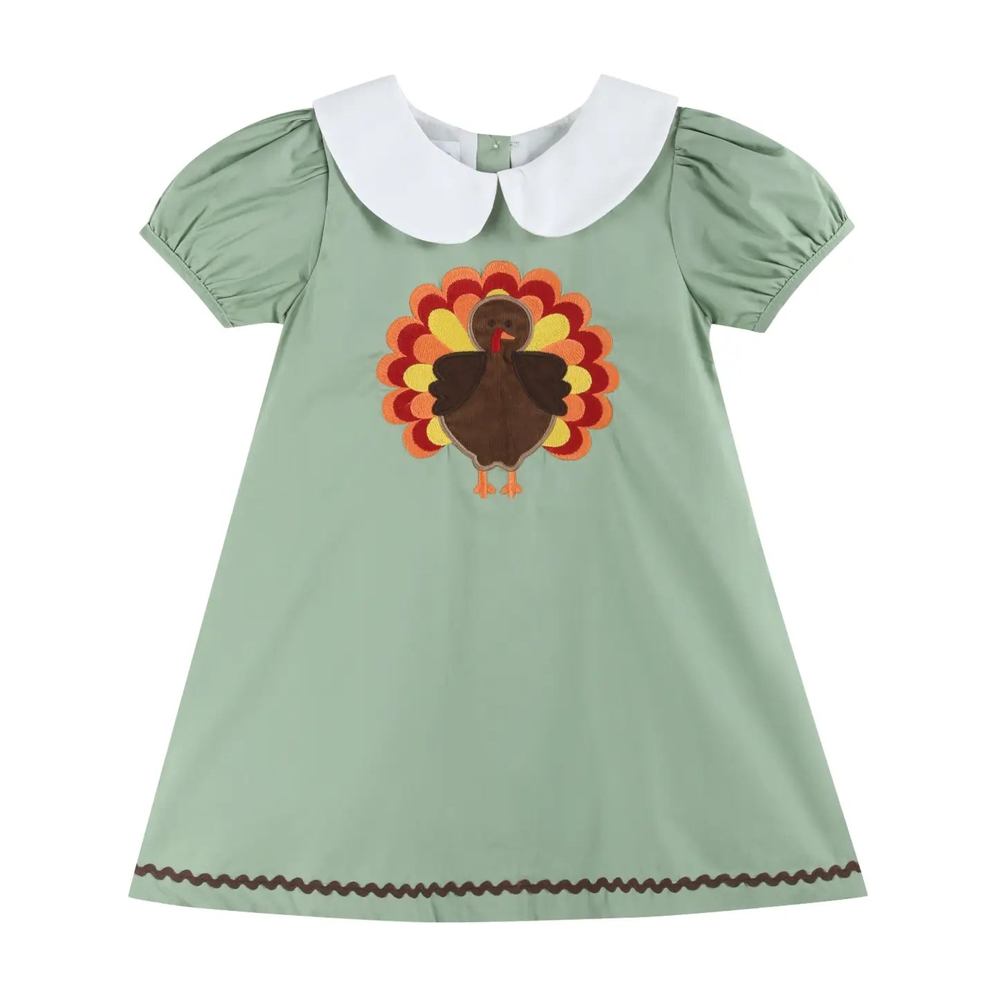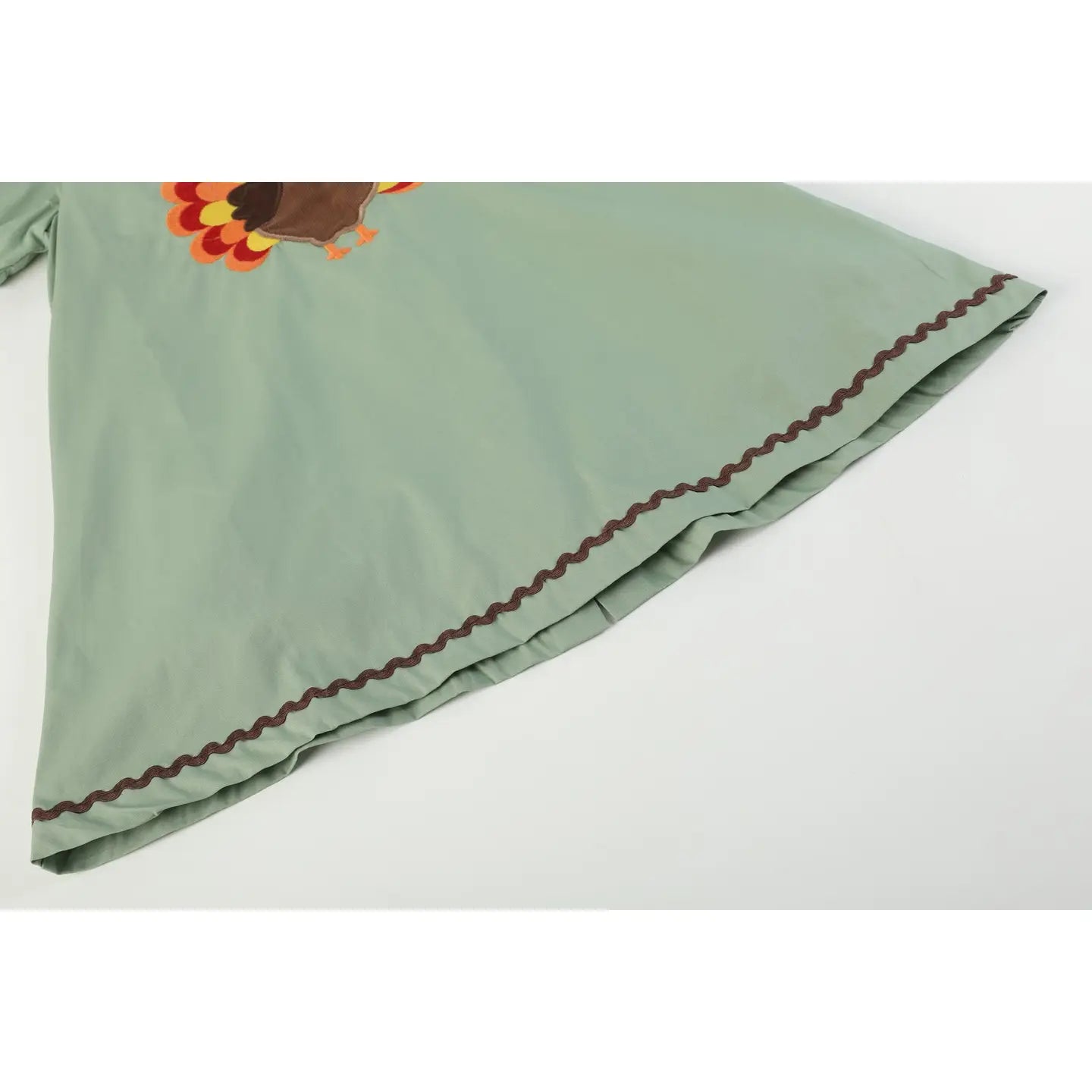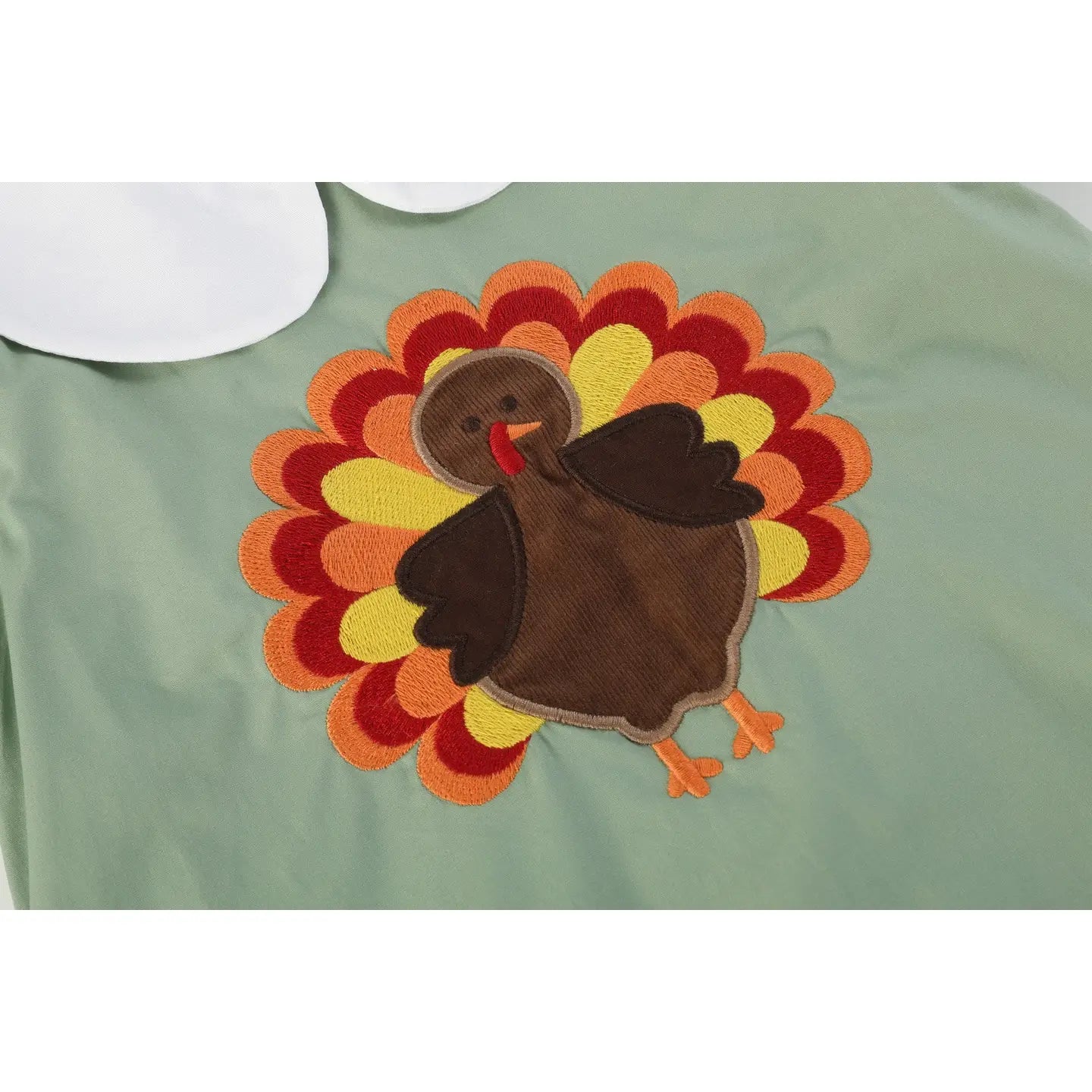 Gobble up the cuteness with our Sage Green Turkey Collared Dress! Adorned with an adorable appliqué turkey, this dress is a festive delight for Thanksgiving celebrations. In charming sage green, it's the perfect outfit for your little one to strut into the holiday season with a dash of Thanksgiving charm.